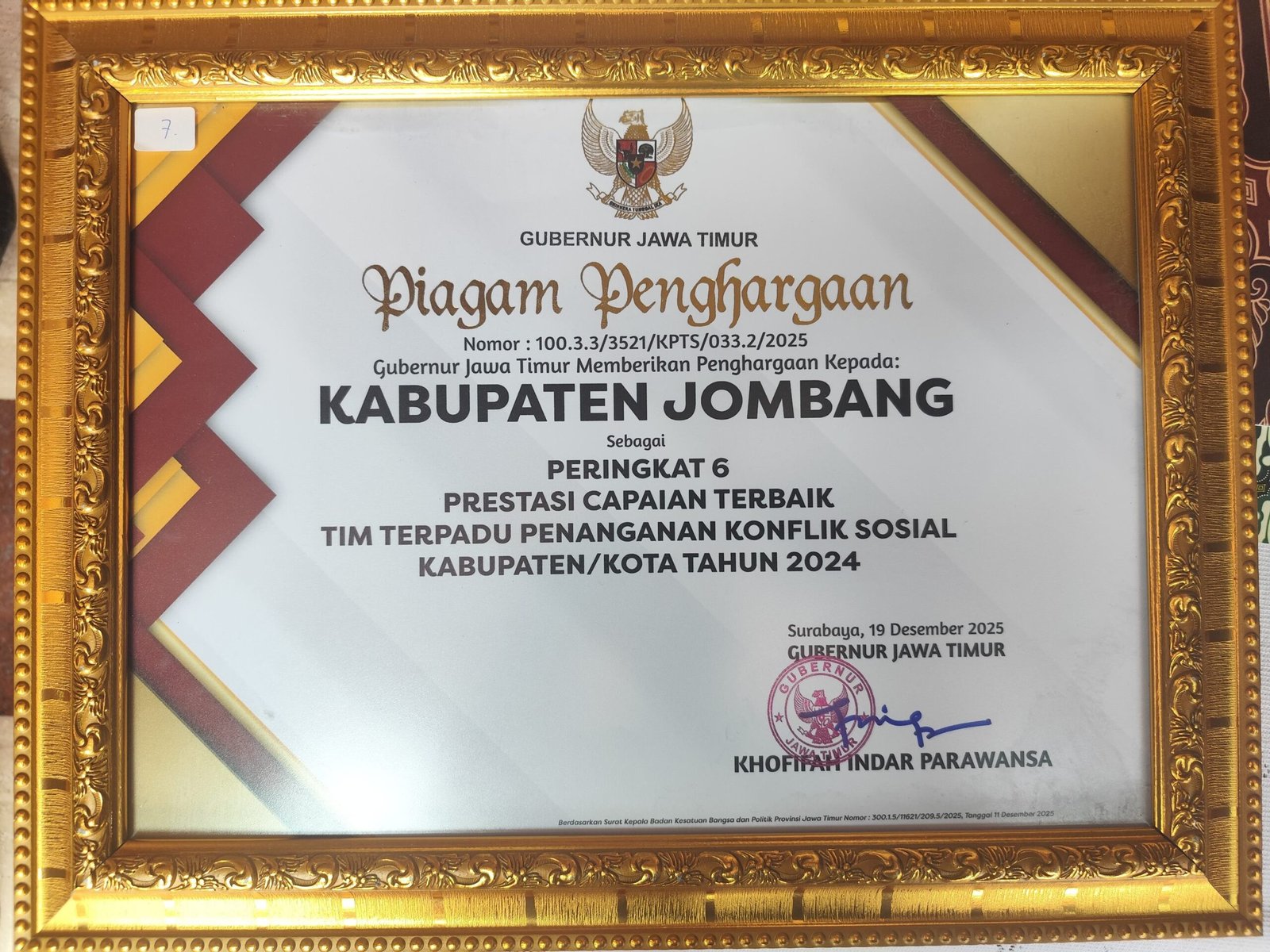 Team Kabar Online – Gubernur Jawa Timur memberikan apresiasi kepada Bupati Jombang, H. Warsubi, S.H., M.Si., dalam Evaluasi Pelaporan Aksi Terpadu Penanganan Konflik Sosial.