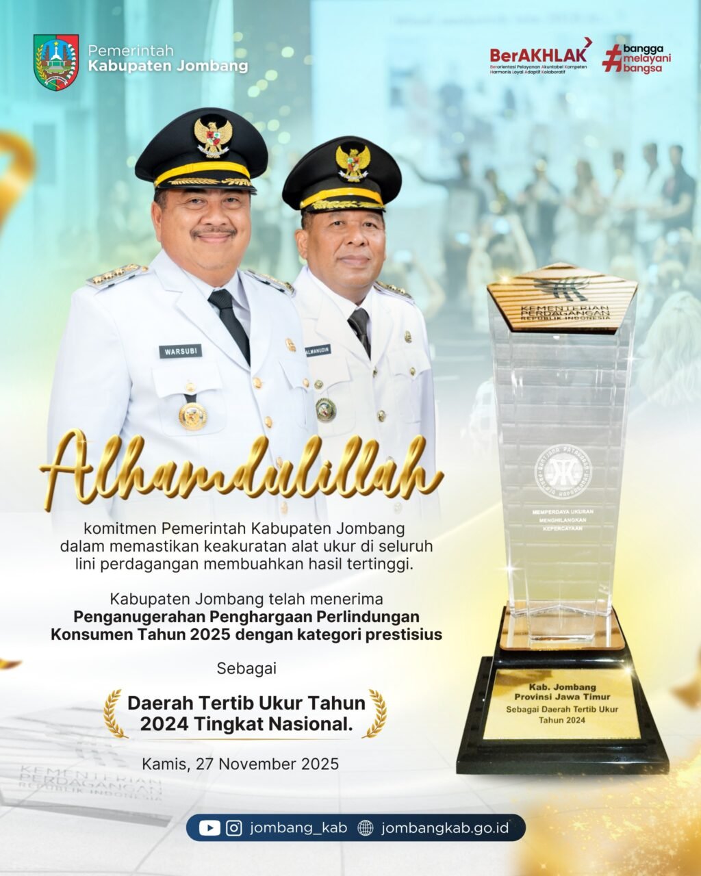 Team Kabar Online – Pemerintah Kabupaten Jombang meraih prestasi tertinggi dalam bidang Metrologi Legal setelah menerima Penganugerahan Perlindungan Konsumen Tahun 2025 untuk kategori Daerah Tertib Ukur Tahun 2024 Tingkat Nasional.